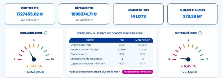 - Vue globale et intuitive du projet (visualisez la répartition précise des surfaces, coût de revient global, CA prévisionnel, nombre de lots, rentabilité du projet)