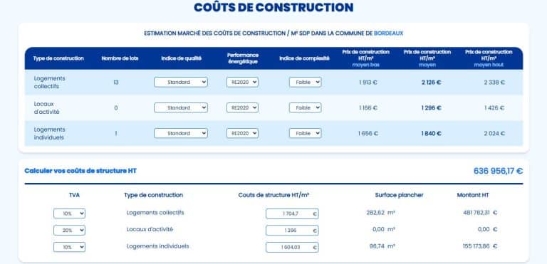 - Calcul rigoureux des coûts de construction (indice IRIS, coûts de maion d’oeuvre locaux, indice de densité, nombre de lots…)